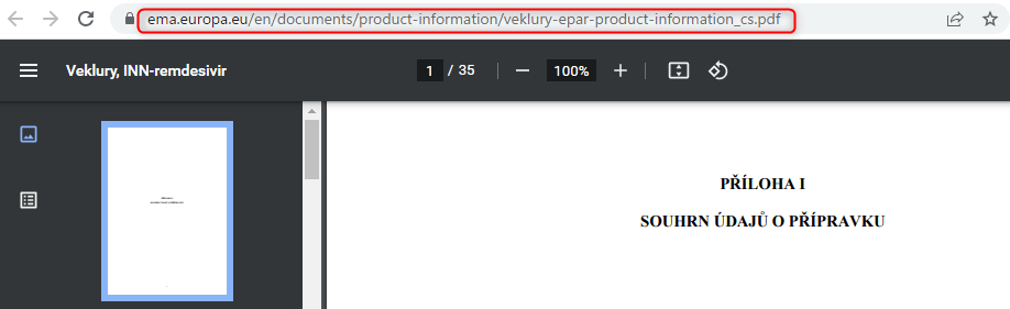 ちなみにリンク先はどちらも同じファイルになっており、EMAのウェブサイトにある該当医薬品のEPAR(Product information)のチェコ語版となっています(前半が製品概要、最後の方が患者向けリーフレット)。