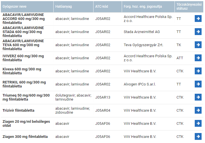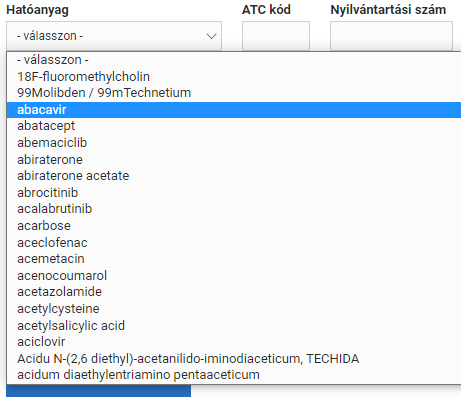 項目「Hatóanyag」に「abacavir」を選択した状態で、下の青いボタンを押下します。