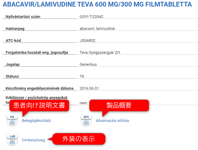 上から、登録番号、成分名(アバカビルとラミブジンの合剤)、ATCコード、販売企業などの情報が並んでおり、その下に、患者向け説明文書(PIL:Patient information leaflets)、製品概要(SPC:Summary of product characteristics)、外装表示につながるリンクがあります。