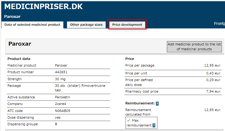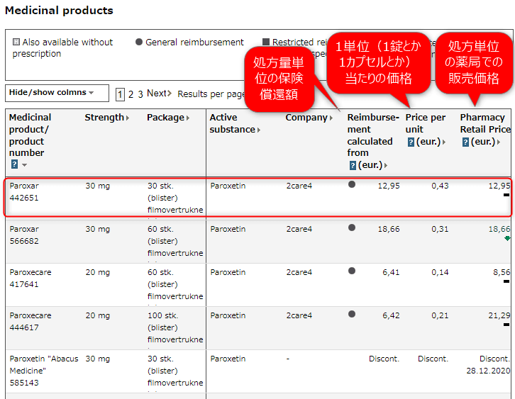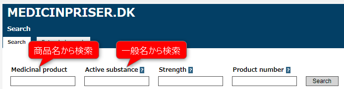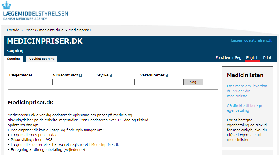 デンマークで販売されている医薬品の薬価や一般的な保険償還額はこちらで調べることができます。