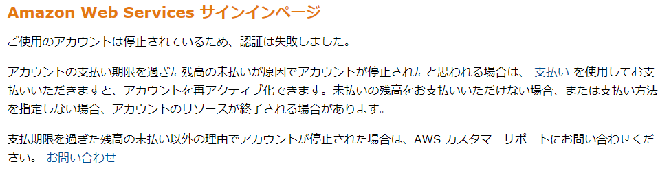 その後に他の画面に変遷しようとしても、以下のように「アカウントが停止されているため…」という画面になります。