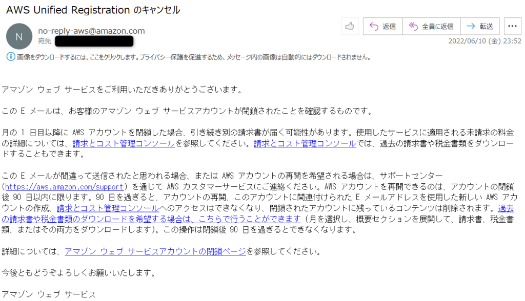 また、AWSのアカウントの作成時に登録したメールアドレスに、アカウント閉鎖に関するメールが届きます(メールのタイトルが分かりにくいですね)。