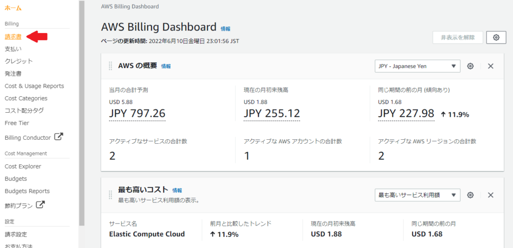 「AWSの概要」「最も高いコスト」といった情報が表示されています。