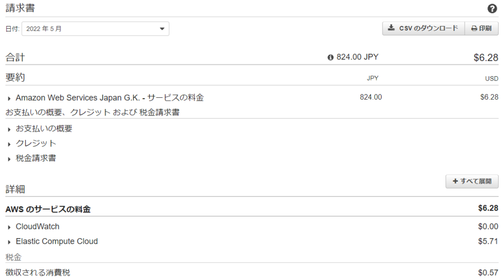 いくつかのEC2のインスタンスは作ったまま放置していましたが、全て停止しており、課金に繋がりそうなものはほとんどないと思っていたのですが、そんなに甘くはなかったようで、初めて支払いが発生する請求書が届きました(正確に言えば、AWSさんからもらった$25分のクレジットが枯渇したことが背景にありました)。