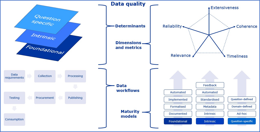 規制当局の意思決定に使用するデータ資産を選択するには、その資産が信頼性(Reliability)、Extensiveness、網羅性(Coverage)、一貫性(Coherence)、 関連性(Relevance)の基準をどの程度満たしているかを知ることが最終的に必要である。このような品質の次元は、生成から処理、集計、最終的な分析に至るライフサイクル全体に沿って構築され、その過程で、もともと他の用途のために集められたデータを再利用することができる(倫理的または法的要件が満たされている場合[12])。