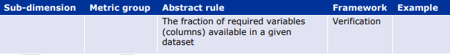 • 完全性(Completeness)とは、データ収集のプロセスとデータ形式を考慮した上で、利用可能な情報の総量に対する利用可能な情報の量を測定するものである。データセットで利用できないデータは「欠損」と呼ばれる。例えば、あるデータセットにおける必須項目(性別など)の値が欠落している割合が、完全性を測る指標となる。