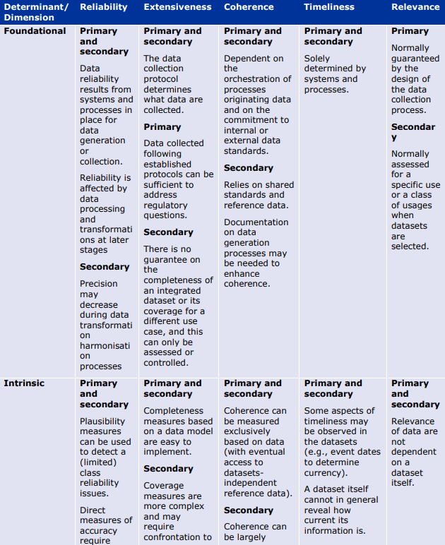 ガイドラインと評価指標(metrics)を適用する際、データの一次利用と二次利用の間に重要な区別が生じる。システムが特定の一次目的のためにデータを収集し処理するように設計されている場合、または二次利用のために確立された一連の要件が存在する場合、固有的かつ質問特有的なDQの側面は、収集および生成の時点で すでに考慮されている可能性がある。したがって、エビデンス生成に必要となる、ある程度の品質レベルを保証するシステムおよびプロセスを設計することが可能である。しかし、想定していなかったデータの二次利用の場合はそうはいかない。二次利用のための品質基準は、既存のデータ収集の目的に関連した基準とは一致しないことがある。この場合、ほとんどのDQは事後的にしか管理できない。
