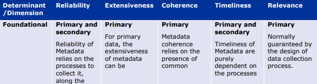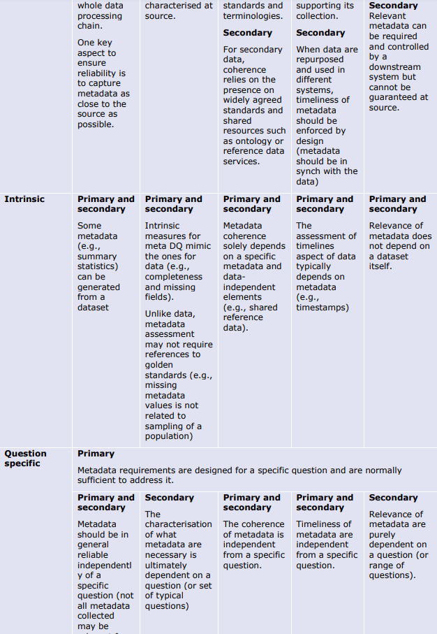 以下の表は、データとメタデータの両方について、品質の決定要因(基本的、データ固有、または質問固有)が異なる品質次元にどのように影響するかを例示したものである。これらの表は、データライフサイクルのどの段階でどのような評価指標や措置が適用されるかのガイダンスを提供する。例えば、Extensivenessの次元は、基礎的な決定要因のみによって決定される(例えば、製造時)。さらにデータのライフサイクルの中で、データ固有の指標は信頼性(reliability)の程度を部分的にしか評価できない(plausibility metrics:「もっともらしさ」の評価指標)。