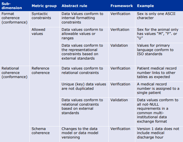 適合性(Conformance)は、特定の参照やデータモデルに対する一貫性(Coherence)を評価するという点で関連する。適合性(Conformance)は、実質的に一貫性(Coherence)を評価する最良の方法であり、形式的・構造的・意味的な適合性(Conformance)として専門化されています。妥当性(Validity)は、より狭い範囲の適合性(conformance)であり、参照モデルが評価対象のデータセットに固有のものである場合に定義される。
